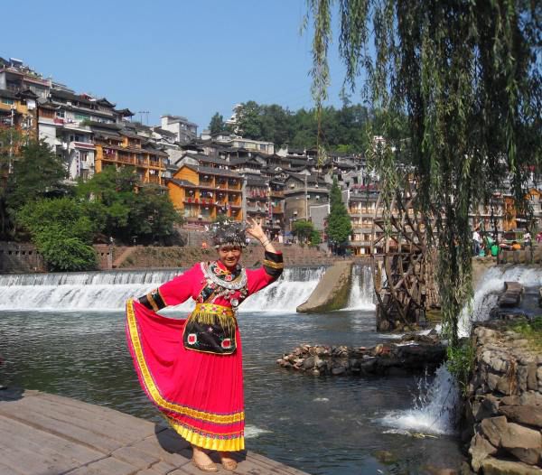 早晨的江边经常会见到洗衣服得妇女,有不少游人“偷拍”,那样的图真的挺美的!跳岩挺好玩的,可以贪玩地走走跳跳哦!把应有的童真找回来!在跳岩和大水车附近有很多出租苗族服饰的摊档,价格3——10元/套,在凤凰大桥下面那个大水车租服饰3元即可。苗族头饰又高又大的,戴上去,样子都被遮得七七八八啦!出于贪玩,我也租了一套照,感觉穿了服装还没我原本的样子好看呢!