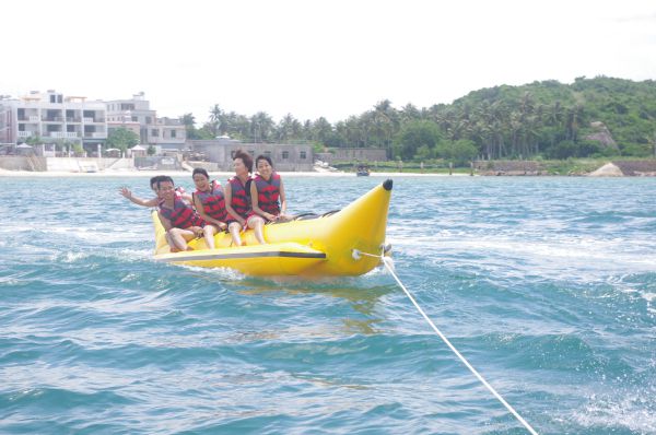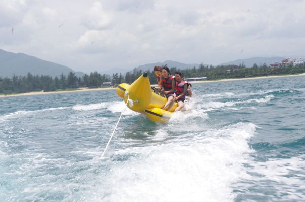 快艇弄好了,接下来就是香蕉船,用一根10米长的尼龙绳,一头绑在香蕉船上,一头绑在快艇的尾部,然后让朋友们穿上救生衣,一排儿坐上香蕉船,前头快艇开动,后面香蕉船也跑了起来,这个东西需要技巧,船上的人必须通力合作,一起把控方向,以免一个不稳,就掉到海里面去了,一般来讲翻船是难免的事,不喝上两口海水,又怎么算来三亚。
