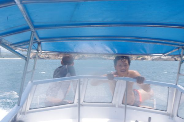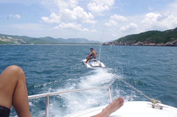 没办法的情况下,赶紧抛锚停船,可惜水太深,估计10多米,锚挂不到底,我们就这样被风一路吹,一路飘,都快飘到蜈支洲岛上去了,离岸越来越远,差不多快飘了50米,大家倒也不怕,就随波调侃,坐在船头享受阳光和波浪起伏,间或想想怎么处理这个事儿,这样的情况不可怕,毕竟离岸边不远,有朋友发现了就会马上过来接我们的,因此也显得有恃无恐。
