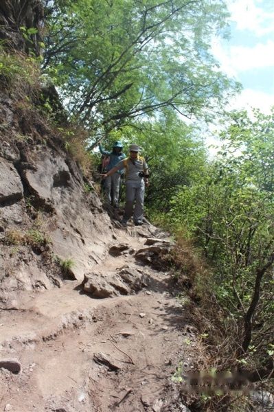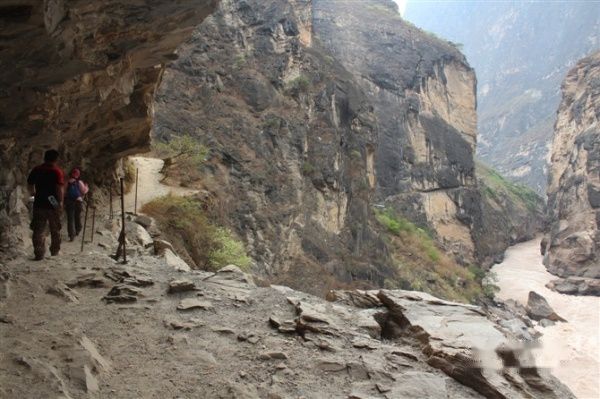 下图就是我差点进天堂的地方,因为七岁小盆友骑着骡子,唱着小曲上去的,所以我成了最慢的一个,领队一直在最后陪着一起走,我当时准备扔一个矿泉水的瓶子,可是我一脚踩空了一块木板,根本来不及反应,领队就在我身边,听到声音,转过身一把拽住往下掉的我,只记得当时已经吓蒙了,一只腿挂在万丈悬崖的木质栈道下,一只腿卷曲在栈道上,没有意识到要爬起来,是领队把我硬拉上来的,拉上来后我腿软的根本站不住,瘫在地上了,然后反应过来就是抱着领队的腿猛哭。。。从此我记住了他的名字——扎史次里。