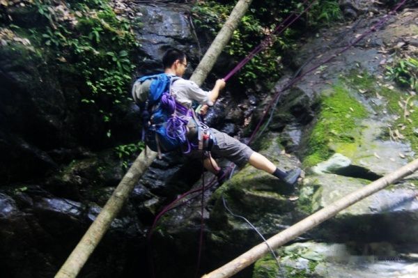 我们沿着溪水一路往下,到达一个将近5米的坡,领队决定打保护下降。于是我们一个一个在两个领队以及另外一名队员(据说是另外一个俱乐部的领队)的帮助下安全下降到下面。基本上我们队里的队员都是第一次有这样的经历,很新鲜,可惜一下就到底了~