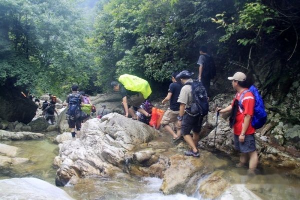 我奔以为溯溪线路是在小溪边上走,能保持不湿鞋的状态,虽然我也专门准备了溯溪鞋,不过骨子里还是不想下水。大概猫是天生怕水的。