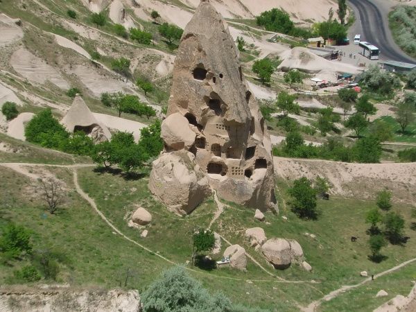 乌其希萨尔是六十米高的巨大岩石,像一件现代主义的艺术品,数个圆锥型的巨岩被早期的定居者挖空建成要塞,相连形成庞大社区,巨岩上有数不清的洞口,外敌入侵时,平时就在洞穴社区存好水粮的居民,可以躲上数月不必外出。乌其希萨尔山顶上面的土耳其国旗在飘扬,召唤着人们勇敢地登上山顶。