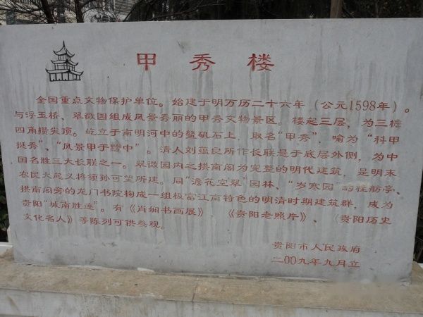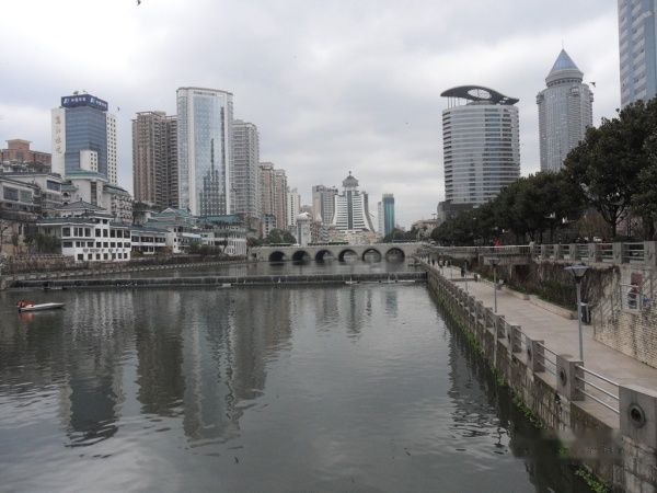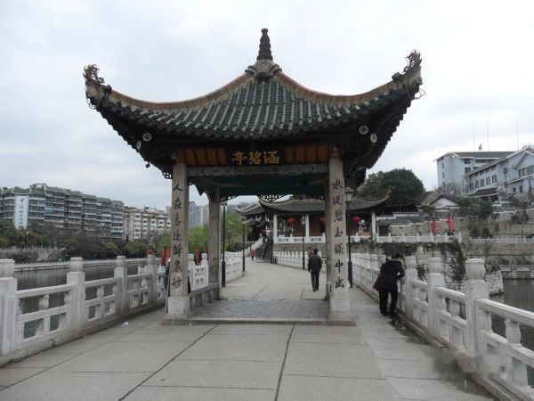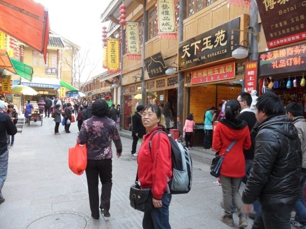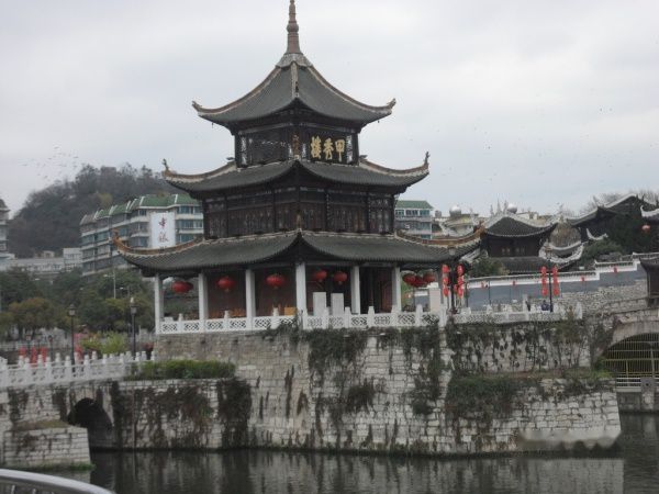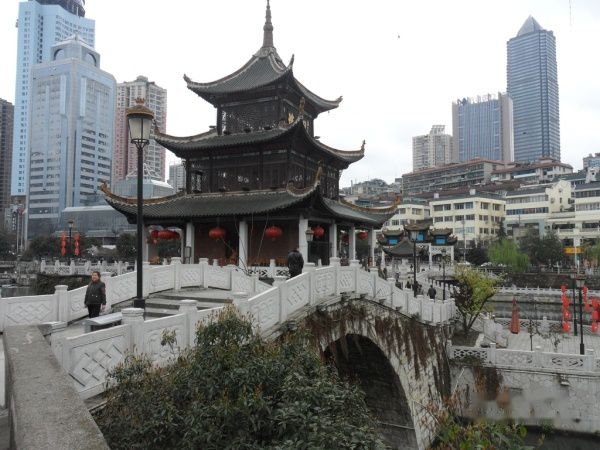 第五天:目的地贵阳青岩古镇和甲秀楼。早上在火车站乘20路公交到河滨公园站下车,于公园正大门右侧路边乘210路公交直达青岩古镇,20分钟一班。大约经过70分钟运行,于11.30到达。古镇街道上全是商店,买各种糖类食品,购买的人不多。景点有好几个,但是都要门票,少则2圆,多则十几圆。前去参观的人并不多。房屋建筑 还是有一些古老的,多数是现在打造的.总之 还是有点古乡古色,可以去看一看。下午1点乘车返回。顺便游览了河滨公园。在一位本地的热心老人的带领下,来到了甲秀楼。甲秀楼免费参观,也不要门票,直接进去就可以了。这个建筑虽然已经近500岁了,但还是那么的漂亮,壮观,还可以上楼参观。游览甲秀楼后,步行到了人民广场。这个广场刚刚修缮完毕,代表24节气的柱子,具有民族特色的雕塑,乐器造型给人 留下了深刻印象,使人流连忘返。