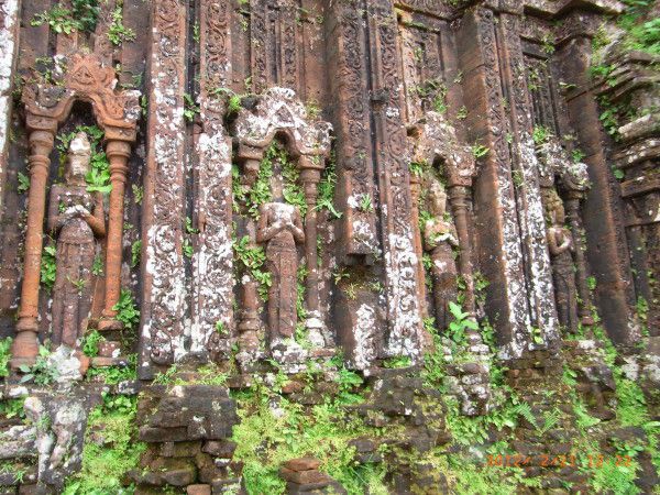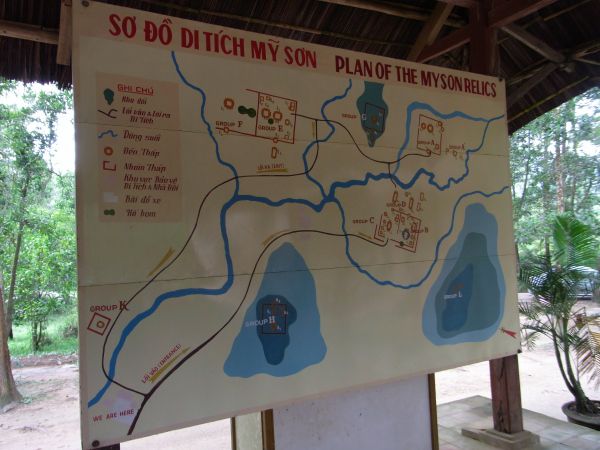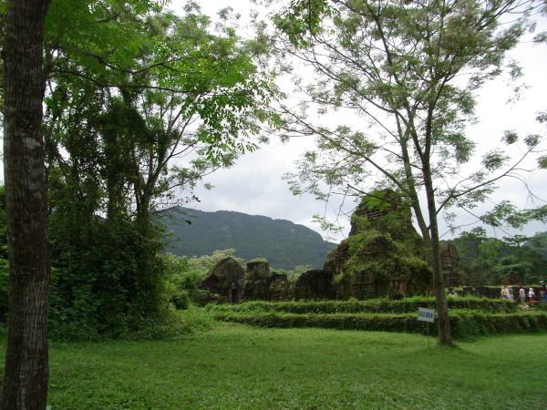 美山听起来像一座山名,但它其实是一个被群山环绕的山谷,在直径不过两公里的山谷中,分布着70来座印度教神殿砖塔的遗址。约在公元四世纪末,占婆国王巴哈德拉瓦曼下令修建了最初的神庙,经过两百多年后,到七世纪初,占婆王桑布胡瓦曼下令重建神殿,这以后一直到十三世纪,王朝每位新王登基时,都要修建一座新塔,因此数百年间陆陆续续建成七十多座神殿和佛塔。十三世纪,首都迁徙,美山遂式微,终于被人忘却。十五世纪王朝覆灭。1885年一位法国人无意间的闯入,才使这个秘境为世人所知,但经过两百年的荒弃,它已经是断垣残壁了。更为不幸的是,越战期间,因为北越弹药库就设在离此不远的地方,所以遗址遭美军狂轰滥炸,受到致命损害。现在地图上虽然把整个景区分为A至H区,但其实可供参观的只有三个区域,其中保存较完好的更只有BC两区,虽残破不全但尚可一观的佛塔寺庙建筑仅20来座而已。