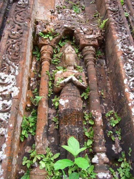 我敢说,大部分的中国人都会认为越南自古就是中国的一个附属小国,其政治经济文化风俗也脱胎于中国,这种见解其实只对了一半,的确越南的北方,从公元前111年起一直受中国各王朝的支配,直到唐朝灭亡之后,才建立了吴、丁、李、陈、黎等朝代(1400至1428年期间短暂属于明朝),所以在政治文化艺术习俗方面,北方始终深受中华文化影响。但南方的占婆则完全异质于中国,它从公元2世纪起就摆脱了中国的管理,由占人自己建立了“林邑”王朝,后来由于其势力向南扩张,逐渐接受了印度文化的影响,与中华文化之间就更加无缘了。占人自称“占婆”,是从七世纪才开始的,八世纪时他们的王朝名叫“环王”,九世纪名叫“占城”。到十三世纪时,蒙古元朝杀到,经过顽强抵抗,他们虽然最阻止了蒙古人的侵入,但王朝遭受的沉重打击也可想而知,由此被迫迁都,国势也走向衰败,1471年,北方黎朝攻入,占婆王朝遂告终。随着占婆王朝的兴衰演变,美山的庙宇宝塔,也在风吹日晒中渐渐被青草覆盖湮没,终于被世人遗忘。