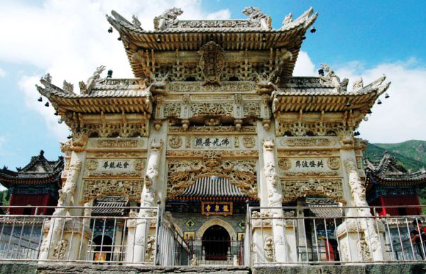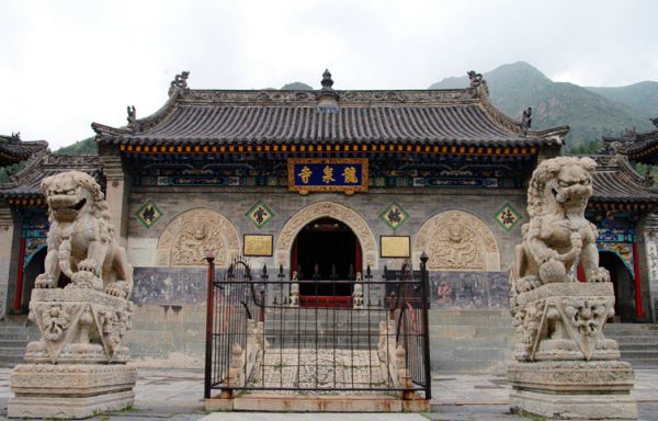 龙泉寺始建于宋代,原为杨家将的家庙。明朝时重修,清末、民国初期扩建,成为南山寺的下院。寺内建筑均为清朝和民国时期的遗物。龙泉寺占地面积l.59万平方米,共有各种殿堂160余间。在平面布局中不同于五台山其它寺庙处,就是寺前并排建有三座山门,各自独立,各通一院,而每一院落,横向又有券洞沟通,可以互相往来,其布局结构极得地形之妙。龙泉寺的胜景,是山门前精致壮观的石牌楼。寺中的影壁、牌坊、墓塔是三件艺术瑰宝。影壁和牌坊与东院处在一条中轴线上,由108级石板台阶相连。