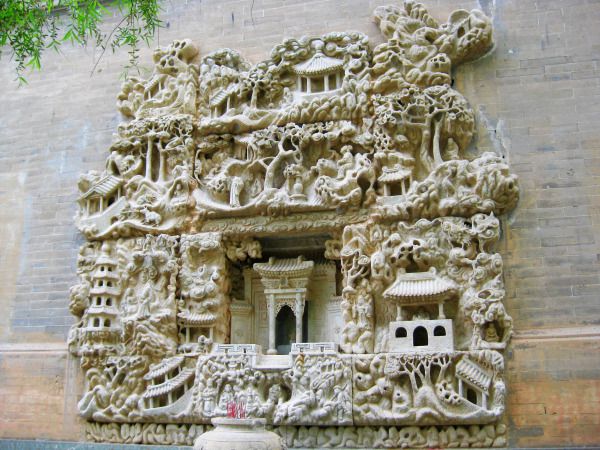 照壁可说是五台山主要寺庙的微缩示意图,中心这个葫芦形宝塔代表台怀中心的大白塔;中下端所雕大殿则是中台顶的演教寺;西北角殿外一人在叩头,代表佛母洞;东南侧这一山洞,洞中有坐像,标志观音洞,供有弥勒佛的楼阁代表栖贤寺。这组石雕,刻工精细,构图巧妙,堪称一绝。
