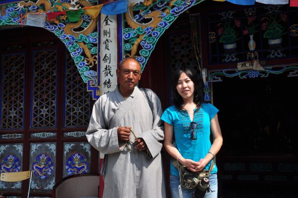旅行团的团员和其他游客们大多在前院,不像我们喜欢避开人群,随处乱走,在一个僻静的院落里,巧遇一位从四川来的游方僧人,听到我对院落一处门上贴的对联发的议论后,加入我们的谈话,末了说我有佛缘,将他手上所拿的一串佛珠送给了我,虽然我并不信佛,所发议论其实亦是泛泛,不值一提,但这种赐予还是感到惶恐之余亦有些兴奋。呵呵。谢谢这位正国法师。
