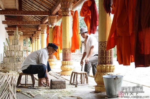 (缅寺里老工匠在制作竹器。)