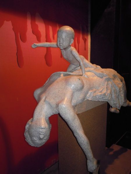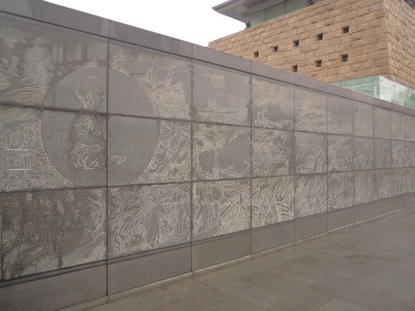 拾级而上,一幅长29.8米、高3.15米的“淞沪魂”线刻画卷主题墙跃然眼前。在被日军炸毁的上海南站,一名婴儿独自坐在铁轨旁哭泣,面对如此暴行,上海民众发出抗日怒吼,英勇杀敌,激起全民族抗日运动。
