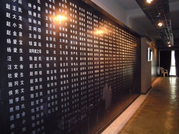 一进展厅,一名黑色的墙上密密麻麻刻满了名字,上书“罗泾大屠杀遇难同胞名录”。
