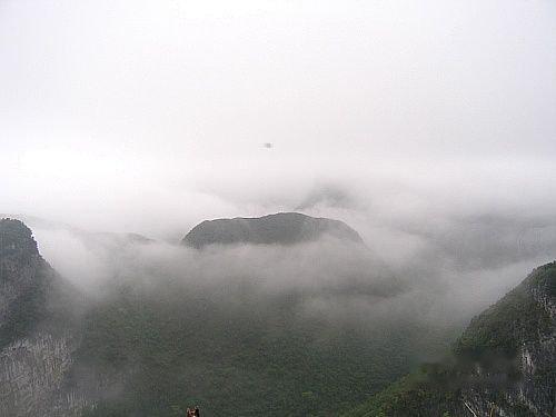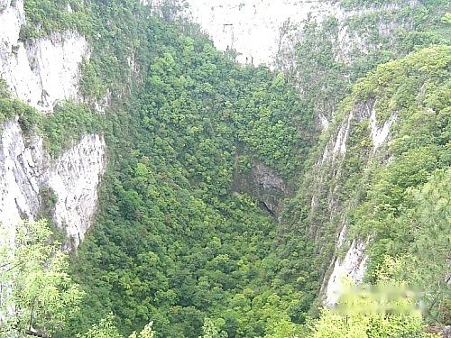 到了大石围,买票告知:现在进山没用,看不见大石围,有雾啊!昨天下午2点才能见,昨晚下雨,今天还不知能否看到呢。怎办?售票员告诉:先去穿洞天坑,完后再联系大石围,看看雾散了没有。只好这样!