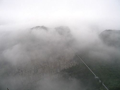 大石围天坑因新疆空子王子更闻名,可以想象出阿布力在这根钢丝上行走一个来回的惊险和刺激!