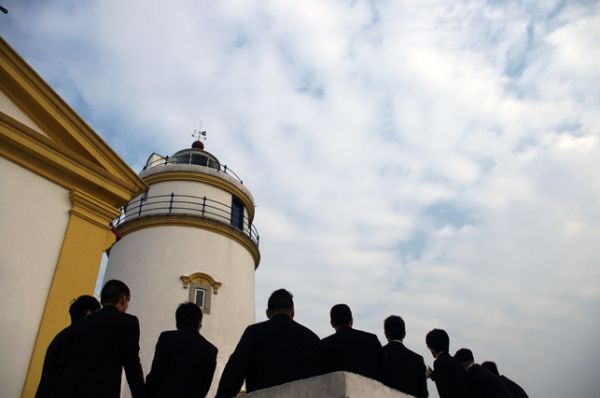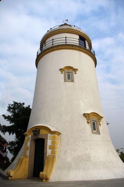 来澳门之前看到一张很漂亮的图片,一座如贵妇般的纯白灯塔屹立在蓝天下,白色与蓝色的相互映衬显得非常漂亮。查了一下那个地方就是东望洋山的灯塔。而东望洋山就在新口岸活动中心的后面。看似很近,可是我步行了半天也没有找到上山的路,又找不到行人问路,这个时间实在是浪费得可惜。最后还是拦了一辆的士,16HK,确实很近呀,几分钟的车程。在东望洋山主要的景点有松山灯塔、圣母雪地殿教堂、炮台、防空洞等。东望洋山也叫松山,算是澳门的一个制高点,所以这座松山灯塔还有悬挂台风讯号的作用,在这里可以了解到平常我们听到的所谓几号风球,它所代表的暴风等级。因为白色的灯塔和白色的教堂太漂亮了,所以这个地方也是结婚的新人们常常光顾的地方。我去的时候就有一对新人加上几十个伴娘和伴郎在那里拍照。在这么好的景色下被祝福确实是会让人永生难忘吧!另外这里也是眺望澳门半岛的好地方,如果没有去澳门旅游塔,完全可以在这里弥补遗憾。