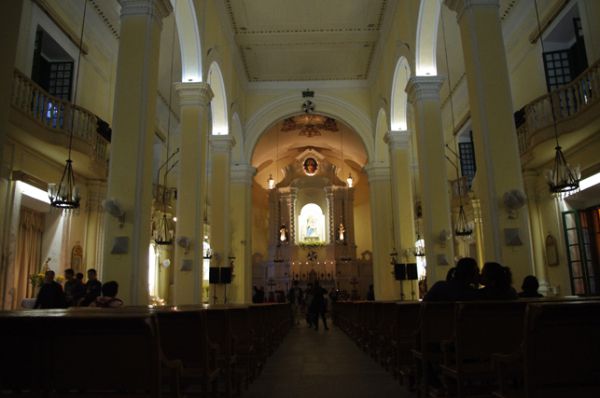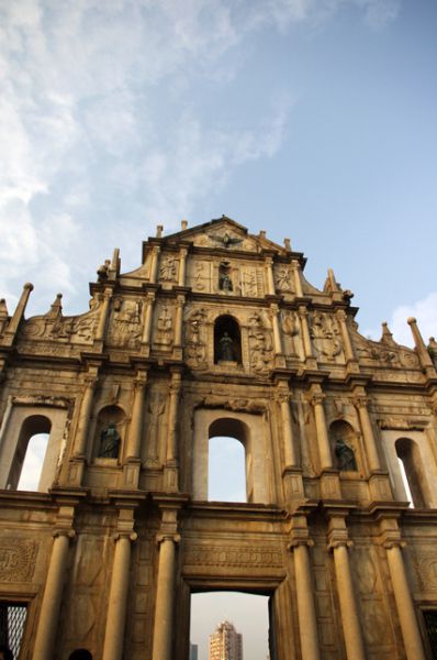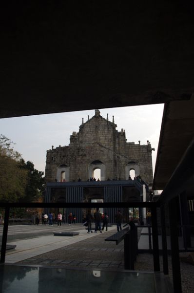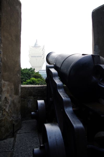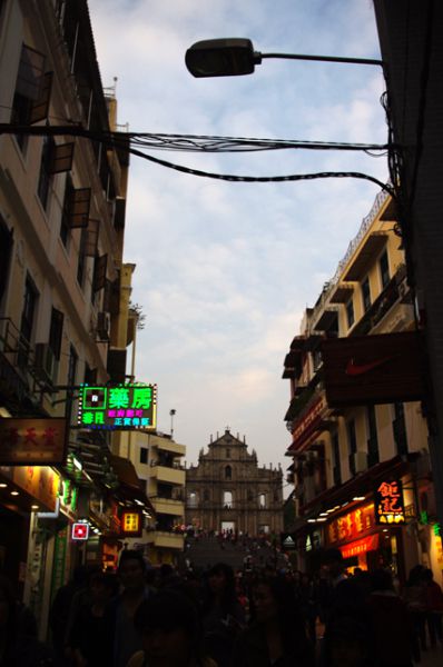 本来准备从东望洋山步行到大三巴,但在下山的半山腰看到一辆出租车停着,忍受不住诱惑上了车,到大三巴的车费有19HK。大三巴这个景点应该是澳门旅游必到之地,所以人气也是相当的旺,要想找一个角度好好拍一下大三巴也不是很容易的。大三巴本身只剩一面墙了,但是它还是有很丰富的内容向你展示,一定不要只在前面拍几张照就完事,要穿过大三巴到它地下面的博物馆再去看看,相信可以让你有更深刻的印象。另外,大三巴旁边还有一个小小的哪吒庙可以去看看。在大三巴旁边有一座小山,有一个大炮台和澳门博物馆可以参观。那个大炮台有一些相当历史的大炮展示,还有一处展示了战时如何将笨重的大炮推上炮眼,准备战斗。同时这里也算是一个观澳门半岛的好地方。走了一天,实在是太饿了,就在大三巴前面的小辅子里面花30元买了两串鱼蛋,弹牙而又大颗。