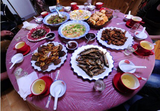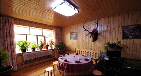 来到韩莲香家的时候,女主人韩莲香的笑容映入眼帘,莲香姐热情的拉着H姐的手说,你们怎么才来啊,快进来,快进来!屋里生了火,暖和,看你们穿得这么少。第一次进这样的民居,家里很干净,进入客厅窗台上的花让我们几个女生激动了,一大朵一大朵的粉红色月季开得很鲜艳,大家拿着相机就开始咔嚓咔嚓,然后开始东张西望,住宿的房间里也收拾得很干净,也摆放着鲜花,窗外是莲香姐家的菜园子,现在只看到些绿色的小丫儿冒出黑土地,小丫儿也十足的可爱。莲香姐张罗我们坐下来准备吃饭,我们几个丫头看到这么漂亮的地方怎么能耐得住性子,在屋里拍完,又跑到院子里面一顿拍,院子里的秋千被我们几个疯丫头当了背景,任我们拍,当然更不会忘了在上面荡会儿。莲香姐张罗好饭菜了,看我们几个丫头还在外面,催我们赶紧回屋吃饭了,我们这才念念不舍的回房间吃饭,桌上已经摆满了菜,炸新鲜华子鱼、葛得列克、煎鸡蛋(我还真没见过鸡蛋煎得这么好看的),还有腌的野猪肉,当然必不可少的是自家烤的列巴和蓝莓酱。姐夫拿着两瓶白酒,看样子今天晚上又得喝了。WF是主力军,作为我们的代表跟莲香姐和姐夫喝,WF的喝酒的实力从未被超越。看着她一杯杯的干,真替她捏把汗,我们杯中的酒都统统进她肚子里了。牛人啊!酒过三巡我们准备撤了,姐夫还怕WF没喝好,准备请她再去喝,被她婉言谢绝了。我们回到宾馆,闹了会也就睡了。悲催的我们因为不知道10点之后不供热水,结果没有洗上澡。在室韦集体供热水的酒店一定要问清楚供热水到几点,否则洗澡可就麻烦了。半夜里下起了雨,淅沥沥的,打开窗潮湿却清新的空气迎面扑来,觉得好清新,好久没有呼吸到这样舒服的空气了,似乎回到西南的故乡。这样的夜晚睡得很舒服。