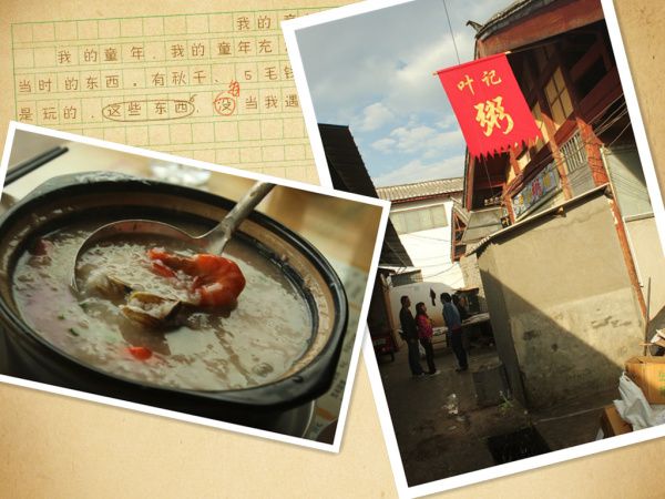 之后的半个多月的日子里,叶记粥铺基本上成了我的据点,到了该吃饭的时间,我就晃晃悠悠的跑去喝粥了。有时候出去玩回来累了,就给老板打电话,没多久他就把粥做好了送到客栈来了。后来我才知道,我第一次去叶记的时候才刚刚开业几天,之后慢慢的人多起来了,外送叫的也多了,想想还是很辛苦的。我总觉得,在古城里可以外送的饭店很神奇,因为游客多,路又不怎么好走,所以粥铺能送粥来我觉得很惊喜,又着实佩服老板这热心又勤快的劲儿。