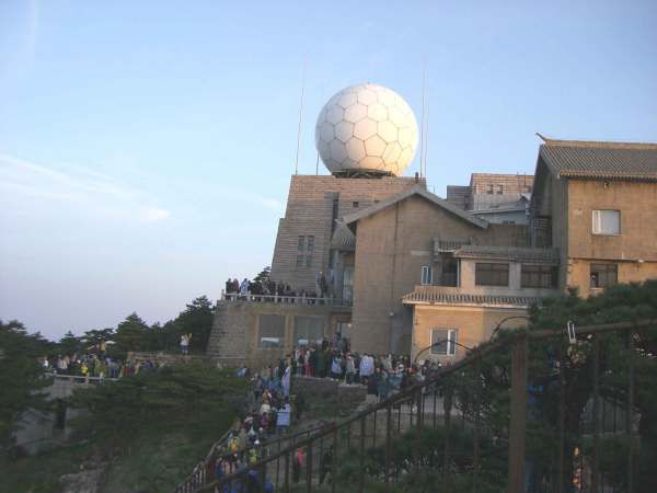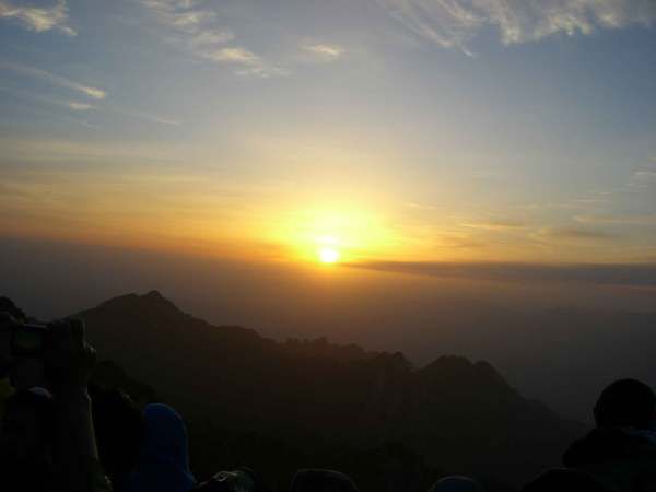 早上黄山的气温还是很低的,你看,有穿雨衣的、有裹着宾馆的被褥的,唉,唉,那几个注意素质,怎么男女俩俩抱一起的……,啊,是俩口子……,抱,别撒手,真有你的,跑这练拥抱……