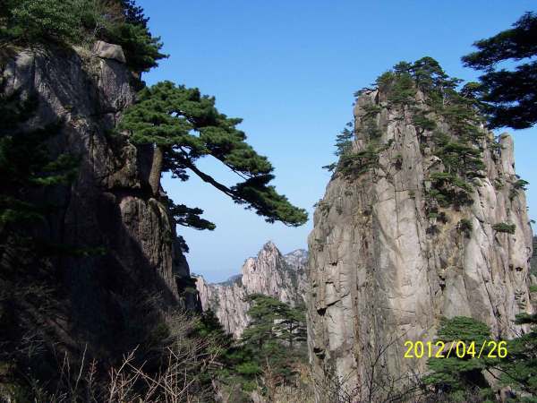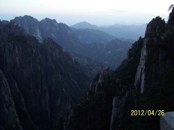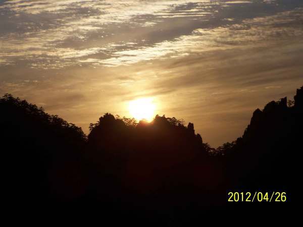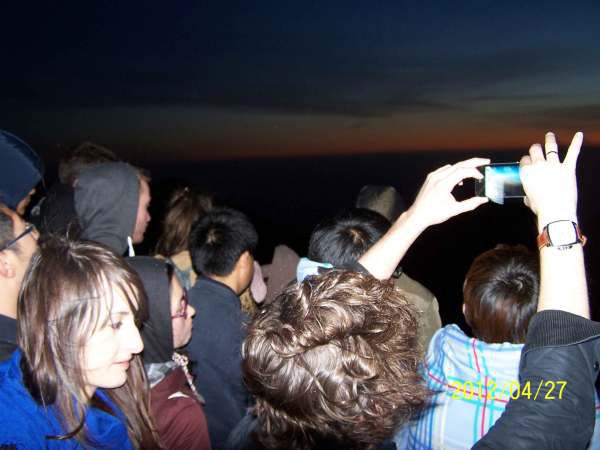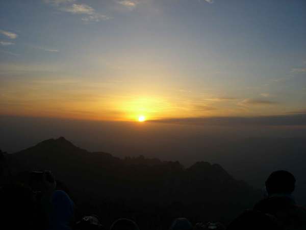 本以为4点起床已经很早了,结果4:20到了光明顶一看,我的天啊,人比树还多,这可站哪好啊,咦,一群外国人ji li wa la的窜到眼前,我大喊一声:中国同胞们,外国友人不远万万里来看黄山日出,发扬一下友朋至远方来,不亦乐乎的风格,让列宁同志先走,话音刚落,人群闪出一缝,我夹在中间,那一刻容不得俺,这外国人到底是吃生肉长大的,身上的味大不说,劲也贼大……,俺双脚一落地,麻利的捣出相机,高举过顶,屏住一口气,咔嚓;