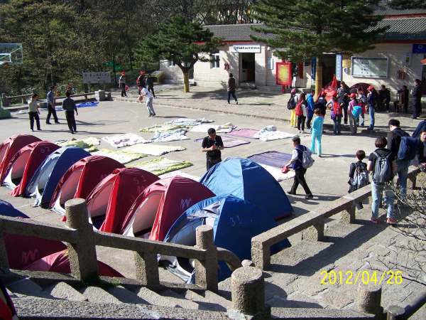 北海宾馆前面的空地上已经开始支起帐蓬了,200元一顶,不讲价。看到照片右上角那一堆人了吧,没提前订房,只能今晚集体睡帐蓬了,今天山上的气温、空气湿度还好,晚上可以目无遮拦的数星星,一颗,两颗……,……啊,银河……,在哪里?,在哪里!?……,看,看……那里是什么,**啊,那边那边……织女?!不,是王母娘娘,……唉呦,不是王母娘娘,是老婆在拎着俺的耳朵……“想什么呢,快走……”“遵命!齐步——走,一二一,哎,哎方向错了”……老婆正在灯火阑珊,不对,在路的拐角处向俺招手呢,追……