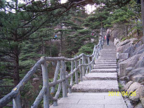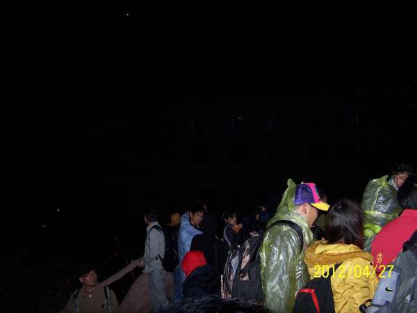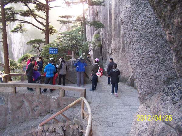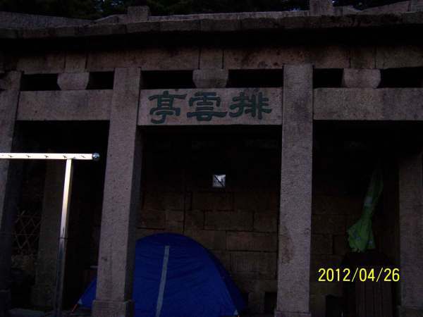 摸着黑往白云宾馆走,还好路上的游客来来往往的,不觉的怕怕,你瞅这排云亭下,这哥们已安营扎寨了,胆忒肥了,难道半夜要跟狐仙姐姐幽会……?羡慕嫉妒……哎呀,腿痛,走了一天的路,这可是、这可是山路啊,我要飞的更高、飞的更…,干脆直接飞床上吧。哈哈!一打听,从排云亭经飞来石再从光明顶山庄前绕下去,才能到白云宾馆。常人要走近1个小时,但,但瞅瞅俺俩经过一天黄山气场的熏陶现在已超凡脱俗了,达到了非常人状态,不信你走走,传说中的乾坤大挪移俺无师自通了,挪了两个多点,看到了灯火阑珊处的“白云”……,倒头睡,爱谁谁、爱昨地昨地;唉、唉哥们,麻烦把门关上,插上,把门插上,俺有梦游的习惯,谢谢啊。