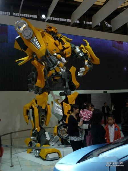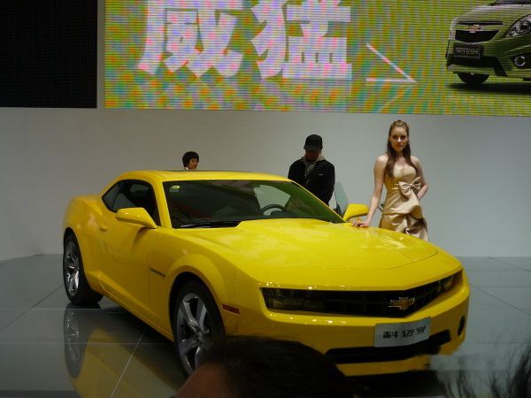 22日办完公事,与上海的同事们吃过午饭已经是下午两点了。出了酒店,马上杀奔车展现场,终于在三点钟时进入了展馆。首先来到E1馆,一睹大黄蜂的风采。看到这个小时候就已经很熟悉的庞然大物,真的十分开心。威猛的大黄蜂人气实在是高,争相与他合影的大小粉丝络绎不绝,想要拍到一张完整的照片那是相当困难,好容易抢了个空档,从侧面拍了张照片,还是难免要把几位观众装入镜头。大黄蜂身边就是雪佛兰倾力打造的传奇英雄,美式肌肉男——科迈罗跑车。