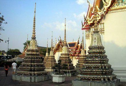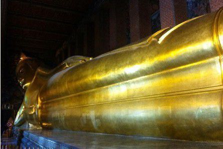 出了皇宫,我问了问路来到了卧佛寺,整个庙是一个美丽的地方,有很多小雕像和不错的泰国花园,所以只是四处走动都是一个美妙的经历。当我看到卧佛时,我对它的长度都惊讶的说不出话了。我情不自禁的用相机拍下了卧佛,周围还有很多像我一样的人。佛像的脚那里还可以看看佛像脚部细致的雕塑手法。我在佛像后面换了一些硬币,把硬币扔在钵盂里许了个愿(愿望说出来就不灵了)。