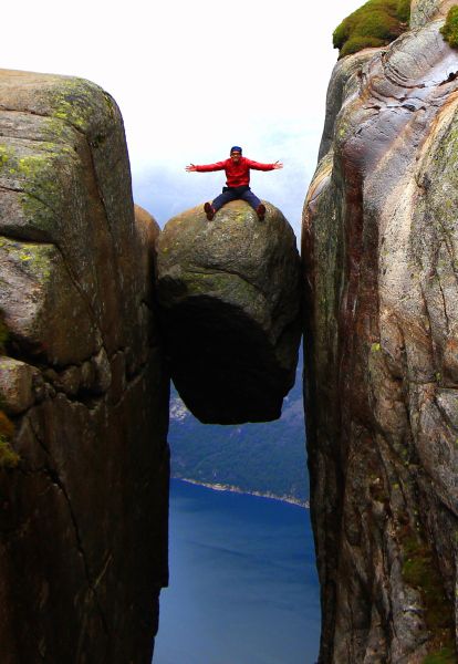 Kjerag or Kiragg 是挪威的一座山,似乎还未有常用的译名,挪威当局就译作谢拉格,在那里984 米的地方有个奇景就是非常有名的Kjeragbolten,有人叫它「奇迹石」,这块石头大约有5立方米,刚好落在高山又深又长的巨隙中,简直是大自然鬼斧神工的艺术品。从下车起点出发,经过又上又落的山路,在斜路上还要手足并用,靠拉着铁链才可登山,走了2.5小时后,终于到达奇迹石。六月天那时还积着雪,相信千年也未溶化,使地面更湿滑,加上不时的阵风,令到同伴都不敢爬上石上,可见令人惊畏的确名不虚传!看见明信片,爬上奇迹石的都是站着的,但既然鞋底湿滑,加上大风,而最重要的是站着的话,是有机会看到千米下的峡湾,只会增加惊畏感,于是我选择贴地爬上去。这样的话,加上想象自己不在半空,其实一点都不危险,而且石面都有一米多阔,坐着便看不到下面深渊,于是我便能强颜欢笑放开双手完成照片!幸好同伴听着我预先的拍摄指示,不用拍照take two!