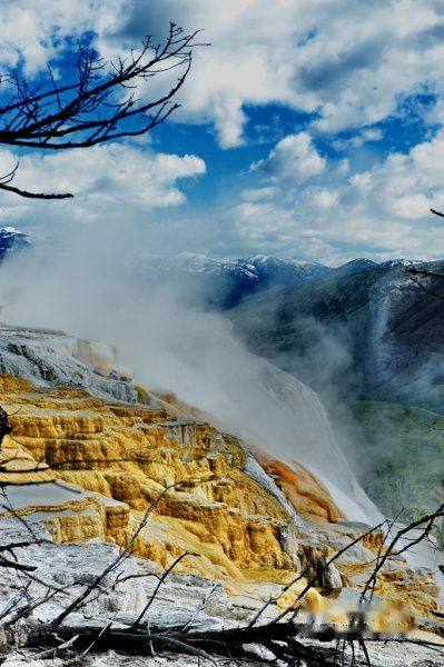 猛犸热喷泉区在8字形公路的左顶端。其特点像我国的黄龙,我觉得不如黄龙秀美,它更显得粗犷,是两种不同的美。另个不同的是它所独具的热喷泉。