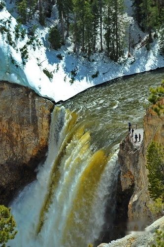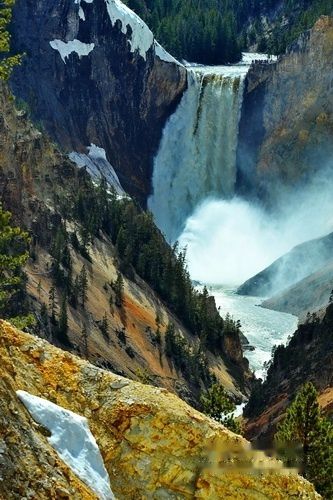 峡谷瀑布区在8字形公路,两个圆相接处的右端。黄石河,它由黄石峡谷汹涌而出,贯穿整个黄石公园。黄石河将山脉切穿而创造了神奇的黄石大峡谷。在阳光下,两峡壁的颜色从橙黄过渡到橘红,仿佛是两条曲折的彩带。黄石河流经黄色的峡谷,形成黄石瀑布,形成景观