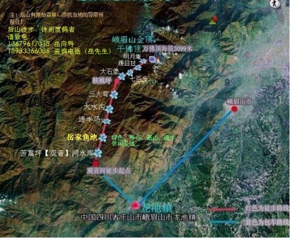 1,观音河——峨眉山主峰(万佛顶)徒步旅行开始, 宜早上从观音河出发(中午12点前,以便有更多时间观赏美景),如到龙池有点迟,可在龙池先住下,第二天早上包车上观音河