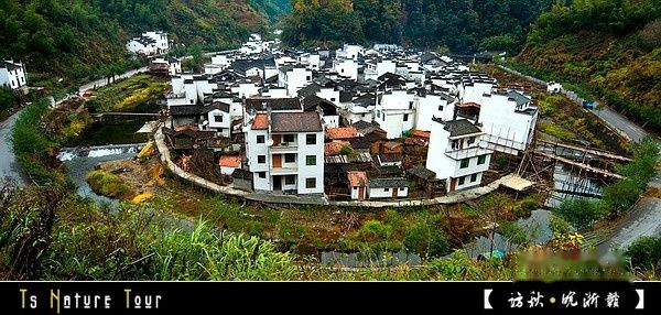 8:40左右,路过菊径村,这是个比较有特色的村落,整个村子被“Ω”形的公路所包围,“Ω”的缺口处是大山,整个村子背靠着大山,沿着村子四周与公路之间,是一条3、4米宽和小河,河上错落架着几座小桥。想要拍摄这个村子的全景比较难,须爬上公路边的一条上山小道至半山,才能勉强将村子及道路摄入画面。由于我的相机是APS-C画幅的,使用了12-24mm的12mm端,但尚有部分无法全部摄入,最好是全幅相机,16mm的广角应该没问题。