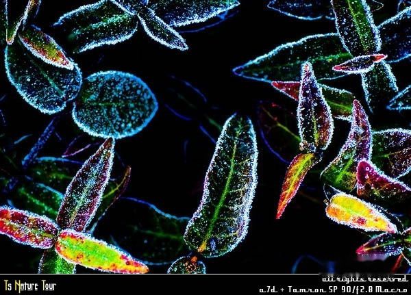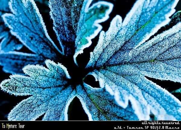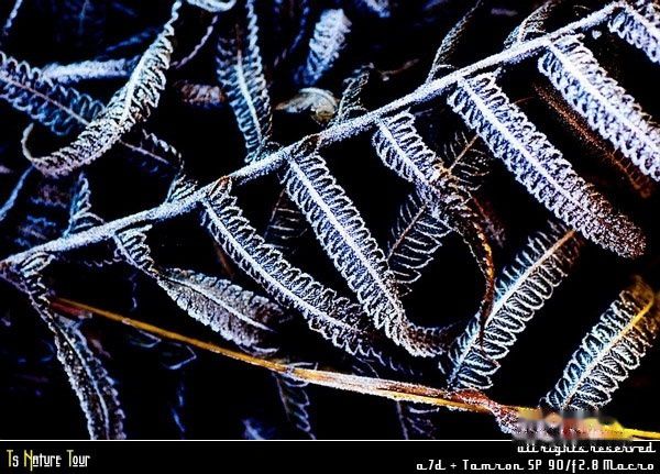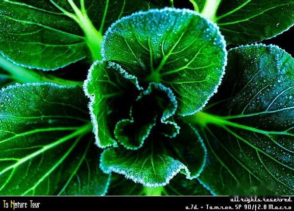看了看胖子,胖子心领神会,雾太高了,必须再往低处或进入村子才有照片可拍。沿着进村的小路一路往下,雾很浓,太阳已经老高了,但阳光却穿不透这厚厚的浓雾。我完全没了能拍出点好片的指望,低头正走着,突然发现周围地里的植物、蔬菜都结了薄薄的霜,形态各异,马上告诉胖子,各自换上微距头,寻找与他人不同的世界去了。