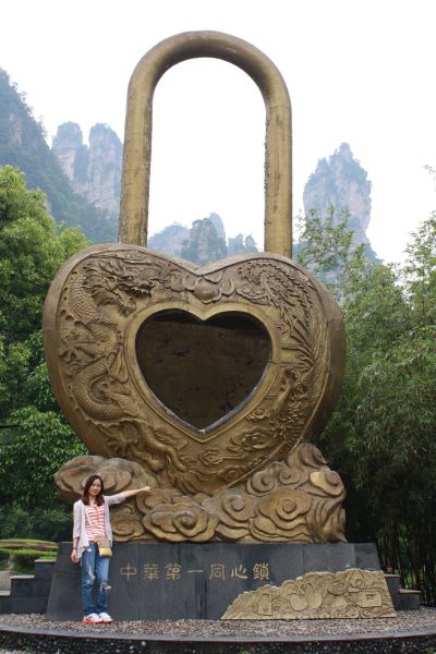 经过一个很大的同心锁,正式进入金鞭溪游览线。金鞭溪是一条美丽的大峡谷,全长7.5公里,慢得话走完全程得走上两到三个小时,一路上风景如画,一座座山峰拔地而起。沿途有母子峰、猪八戒背媳妇、师徒取经、神鹰护鞭、文星岩、紫草潭、千里相会、跳鱼潭、骆驼峰、水绕四门...这条游览线从千里相会可以爬山上到袁家界,但我们想到以后还有几天的行程,为了节省体力,我们决定走到金鞭溪尽头水绕四门坐百龙天梯上到袁家界(每人56元,高姐和她姐有导游证不需要钱,再次嫉妒)。高姐一路上详细而解,还不时穿插几个小故事,还唱山歌,走走停停,将近三个半小时,我们走到了水绕四门。
