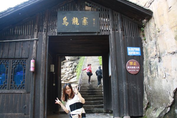 说当导游年这里还藏有一小股土匪。走在七弯八拐的窄窄山路上,想象着土匪在这里健步如飞的场面,经过那“一夫当关,万夫莫开”的三道关口,勾画出一段当年政府军剿匪的血腥场面,耳边似乎隐约还有“砰砰砰”的枪响。来到寨子中央,只见破旧的旌旗虽仍挂在墙上,但早没了一点霸道的气势,火炮、枪杆、大刀静静地躺在一旁,也失去了往日的威武风光。这里面不给拍照,拍照要收费我们就没拍了。沿途的景观有金鸡报晓,回音壁,三道关,一线天,乌龙寨,天波府,原来天波府是一个观景台,之前我还以为是建筑群呢,不过这个观景台看出去的景色绝对赞,还可以隐隐看见卡斯特地貌的城墙结构呢!