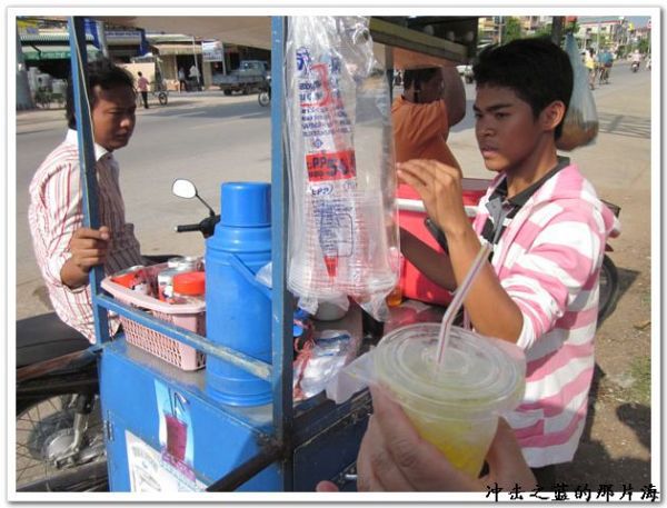 在吴哥,买街头小吃,语言交流还行,但是有时很无奈,却很开心。 和下图卖冷饮的帅哥用烂英文狂聊半天,有时表达半天他听不懂时我自动就说中文了,我问他:难道你听不懂中文?同行的笑弯了腰,