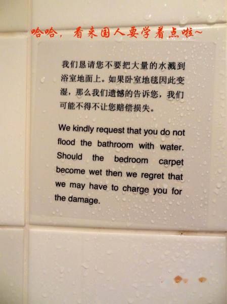 图:客房浴盆处贴着这个中文提示让人有些汗颜