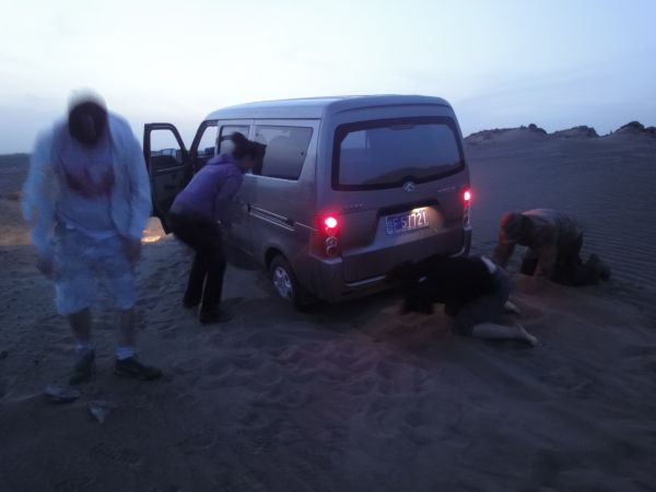 一进入雅丹排到的日落。很美。我们的车子一直朝着罗布泊方向走,一个不小心,陷入沙子里。张哥是经验丰富的老驴了,他带着我们开始刨车