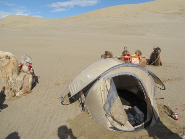 骆驼们驮着我们几个进入了沙漠。之后找到了扎营点,我们搭起了帐篷。黑妞和Karen两个不愿意夜宿沙漠,只有我和David了!