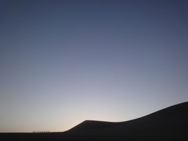 早上醒来,天刚刚亮,远处的驼队向着沙丘进发着,这一幕非常的美丽!