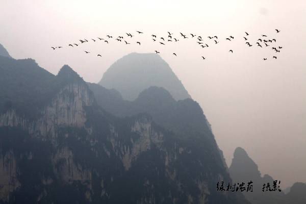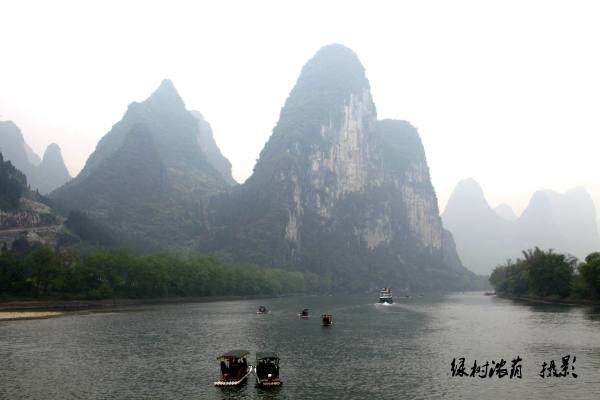 手里握着相机却迟迟找不到感觉。摁动着快门呈现的竟是灰蒙蒙的画面,天气不好,技术和水平又不能弥补,只有望景兴叹,技不如人啊!九牛戏水、望夫石、冠岩、石人推磨、九马画山、黄布滩、螺狮山、兴坪古镇……特别想一睹魅力又神奇的代表漓江神奇又绝美风光的景点,遗憾的都在漫雾飘渺中即瞬而过,漓江这个多情妩媚的水乡灵秀的女郎,没有给我这个北方粗犷率真的汉子一个清晰俊美的容颜,让我千里迢迢的乘兴而来,不无遗憾的期待下一次的赏赉。虽然没有留下清晰的影像,能够亲临雨雾蒙蒙、烟雨缥缈的漓江,还是感觉值得!