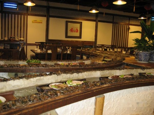“外婆桥”,小桥流水,连菜都是放在小船上随着水流徐徐飘到你的面前,水底居然还有鱼儿游来游去,据说,要是你能抓到鱼的话,店家免费为你烹饪。反正我试了几次,除了溅了一身水,一无所获。