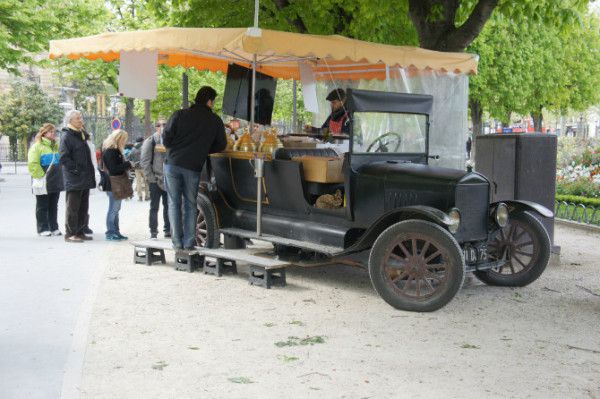 走着走着就看到这个老爷车的煎饼摊子,法国叫crepe, 我很喜欢吃crepe, 鸡蛋和面粉打匀,摊成薄薄的煎饼,里面放上巧克力还有自己喜欢的水果,就成了,虽然肥却是超好吃的。再加个自己做的冰淇淋,哇塞,美翻了,我就是这么吃胖的!