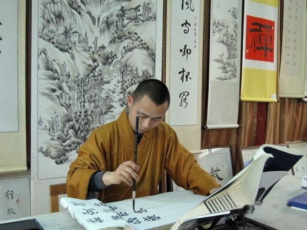 大明寺年轻僧人正在练书法,你看他悬腕运笔,颇见功力。