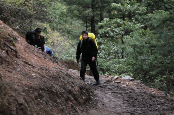 开始徒步,老公背了个70L的大包(没装满),装了2个人3天必要的换洗衣服、日常用品以及路上必要的补给(水、士力架、牛肉干……),我除了相机什么都没拿。不是这3天必须的物品都寄存在了领队家(领队次里是西当人)。
