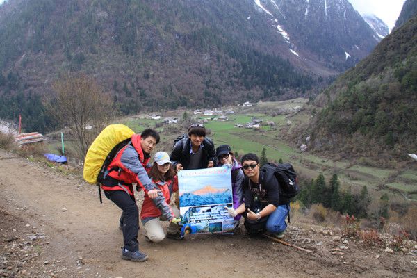 到达上雨崩村,与可爱的领队次里合影,次里是这条线上数一数二的优秀领队,要去的朋友一定要找他喔……次里QQ:375133427,手机:13988790179,次里已经成立了自己的户外俱乐部,我们手里举着的就是他的俱乐部“藏羚羊户外俱乐部”的宣传彩页。我们背后是下雨崩村。