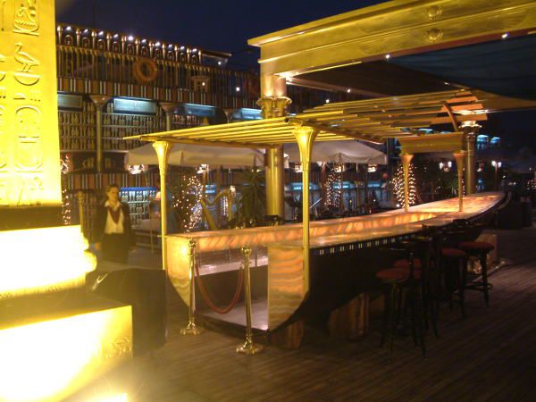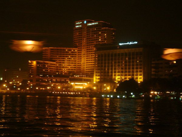 晚上的开罗也很精彩,本国人受约束不能去的地方,作为老外的我们是可以去的,乘游船游尼罗河夜景,边自助餐边看肚皮舞等表演.呵呵,不记得叫什么舞了,就是不停地转,转裙子,转刀,转盘子等等,很好看,就叫转转舞吧。肚皮舞也象二人转一样被改良了,不许露肚皮,所以都是挂一珠帘,抖起来是一样好看。