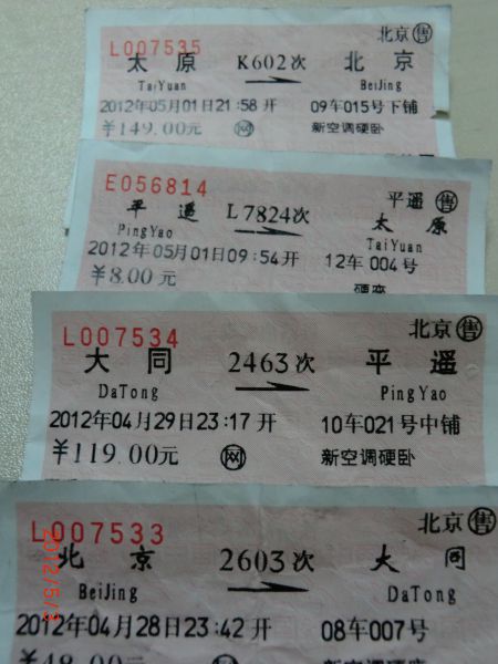 考虑到五一小假出行的人较多,所有往返的车票和平遥一夜的住宿都是在网上提前确定好了的。事实证明:车票提前预订是十二分的明智的。但是平遥的住宿有点过虑了,原先担心五一游人多,住宿恐会饱和,事实是余量很可观,并非我们想象中的饱满。郑家国际青旅的住宿很是出乎我们的意外之外,给了我们极大的震惊。