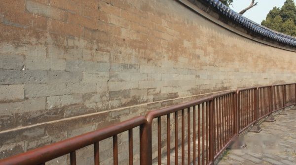 一直向南走,便是皇穹宇了。皇穹宇是皇帝祭神的地方,四周环绕的是最著名的回音壁。围墙由磨砖对缝砌成,光滑平整,弧度过度柔和,有利于声波的规则反射。加之围墙上端覆盖着琉璃瓦使声波不至于散漫地消失,更造成了回音壁的回音效果。只是经过岁月的磨砺,回音壁的墙体已经大面积脱落,听同行的导游说,现在已经无法回音了。当下游人众多,实在很难检验真伪。不过回音壁的四周,都已用铁栅栏维护起来到是真的。
